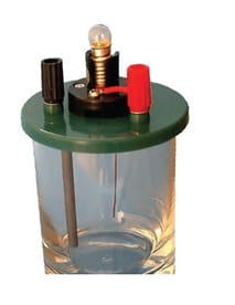 Elektrody typu prętowego wykonane z nierdzewnej stali połączone szeregowo z żarówką. Pomoc wyposażona w dwa gniazda laboratoryjne do przyłączania przewodów z wtykami 4-mm (wchodzą w skład zestawu wraz ze szklanym naczyniem).