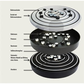 Model do ćwiczeń dla uczniów z 2 atomami, 30 protonami, 30 neutronami i 30 elektronami.