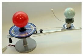 Model wprawiany jest w ruch ręcznie a żarówka znajdująca się w „Słońcu” i oświecająca „Ziemię” zasilana jest na baterie.
