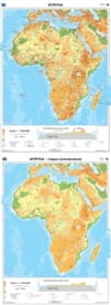- na jednej stronie zamieszczono mapę ogólnogeograficzną Afryki; na mapie przedstawiono ukształtowanie powierzchni kontynentu (zastosowano metodę hipsometryczną), rozmieszczenie obiektów hydrograficznych, położenie najważniejszych miejscowości, linii kolejowych i dróg, przebieg granic państw i kontynentów; mapę wyróżnia bogate nazewnictwo fizycznogeograficzne