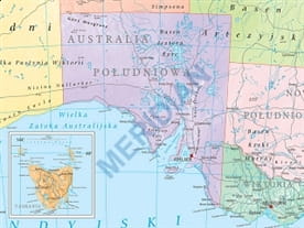 Ścienna, polityczna mapa szkolna przedstawiająca podział administracyjny Australii. W panelu bocznym znajdują się dodatkowe informacje i ciekawostki z podziałem terytorialnym oraz stanowym związane z geografią kontynentu australijskiego. W kartonie dolnym znajduje się mapka Tasmanii.