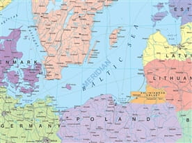 Ścienna, polityczna mapa szkolna przedstawiająca podział polityczny regionu Morza Bałtyckiego.