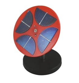 Bateria słoneczna z zamocowanym silniczkiem. Podstawa z ruchomą głowicą pozwala umieścić baterię pod dowolnym kątem w kierunku światła.