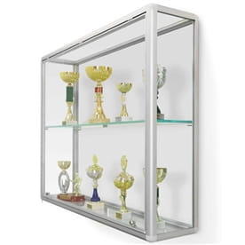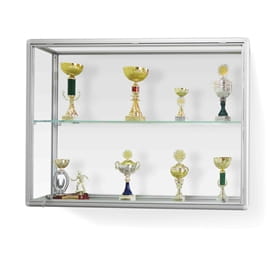 Gablota ekspozycyjna na puchary wykonana z anodowanych profili aluminiowych. Boki gabloty przeszklone, narożniki plastikowe. Drzwi bezpieczne szkło akrylowe w ramie aluminiowej unoszone do góry, zamykane na dwa zamki. W zestawie półka z grubego szkła szlifowanego w trzech płaszczyznach z możliwością regulacji wysokości.