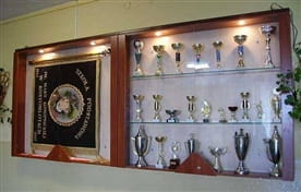 Gablota wykonana z płyty laminowanej o grubości 18mm. Górna część oświetlona wnętrze wyposażone w dwie półki szklane.