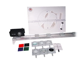 Rozbudowany zestaw do doświadczeń z zakresu optyki geometrycznej , który doskonale sprawdza się zarówno przy demonstracji , jak i w przypadku ćwiczeń uczniowskich. Oprócz trwałej ławy wykonanej z aluminium, wyposażonej w czytelną podziałkę, zawiera również zestaw soczewek w oprawie, przesłonę, dwustronny ekran, oświetlacz, tarczę Kolbego, kolorowe filtry, zwierciadło oraz komplet brył akrylowych o różnych kształtach.