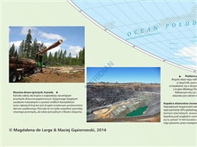 Czytelne sygnatury ułatwiają korzystanie z mapy, a główni producenci opisani są wartościami procentowego udziału w produkcji światowej. Mapa została wzbogacona dodatkowo o zdjęcia ilustrujące przykładowe zagadnienia.
