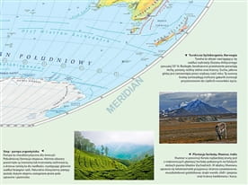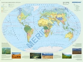 Ścienna mapa szkolna przedstawiająca różnorodność krajobrazową świata. Na cieniowanym podkładzie (z efektem trójwymiaru) ukazane jest rozmieszczenie najważniejszych typów krajobrazu na Ziemi. W treści mapy znajdują się również następujące treści: krainy geograficzne, szcyty, wulkany, punkty wysokościowe i głębokościowe, rafy, prądy morskie, granice i nazwy państw, stolice oraz podział na strefy czasowe.