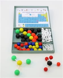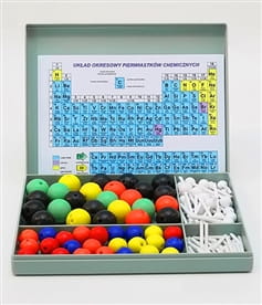 Zestaw kulek (imitujących atomy) i łączników z tworzywa sztucznego, pozwalających na budowę modeli popularnych pierwiastków chemicznych.