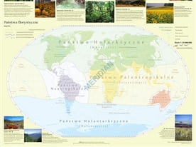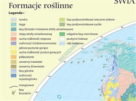 Ścienna, dwudzielna mapa szkolna syntetycznie i czytelnie przedstawiająca państwa florystyczne oraz formacje roślinne na świecie.