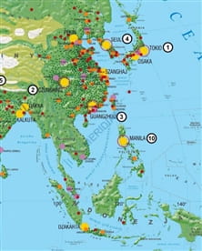 Ścienna mapa przedstawiająca rozmieszczenie ludności na świecie, istotnie zagadnienie z niezwykle dynamicznej dziedziny geografii jaką jest demografia. Na tle stref ekumeny, subekumeny i anekumeny pokazane jest umiejscowienie skupisk ludności powyżej 100 000 mieszkańców oraz najważniejsze aglomeracje naszego globu.