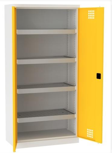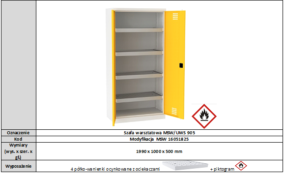 · Szafa na chemikalia w standardzie wyposażona jest w specjalne uszczelniane ocynkowane półko-wanienki wraz z ociekaczami · Szafy posiadają drzwi skrzydłowe wyposażone w 3-punktowy zamek wraz z uchwytem. · Korpus oraz drzwi wykonane z blachy 1 mm · Każda szafa w standardzie na drzwiach posiada naklejkę GHS-02 · Maksymalne dopuszczalne obciążenie korpusu 700 kg · Stopki poziomujące z możliwością regulacji od wewnątrz · Ślizgacze ułatwiające przesuwanie szafy i chroniące podłogę przed zarysowaniem · Możliwość łączenia 2 kolorów bez dopłaty (drzwi w odmiennym kolorze niż korpus) · Możliwość kotwiczenia do ściany · Zamek trójpunktowy z zamknięciem typu RONIS z rączką i dwoma kluczykami w zestawie · Szafa zabezpieczona antykorozyjnie powłoką cyrkonową